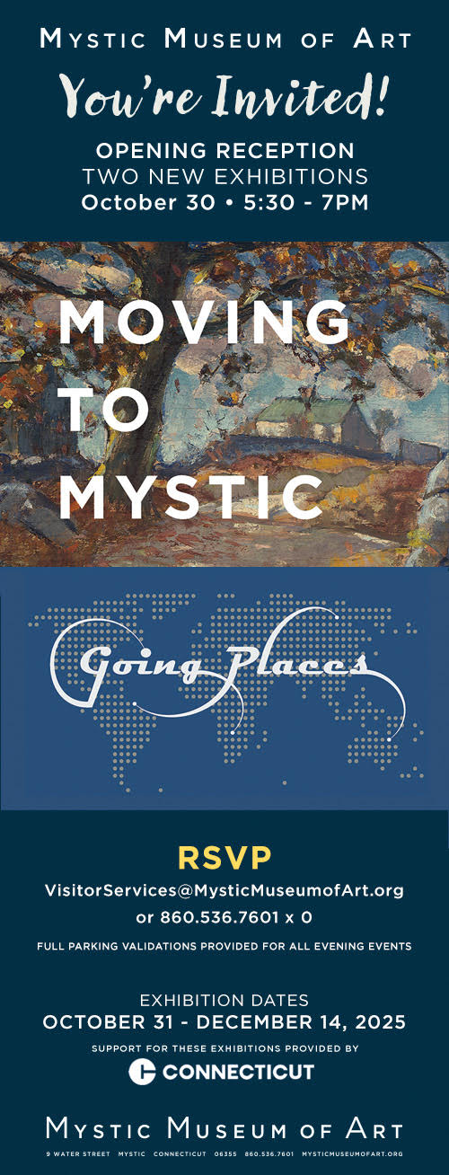 | Throughout history, human beings have moved from one place to another—whether for a season or a lifetime, whether alone or in groups, whether forced by hardship or drawn by opportunity. What is gained, or lost, in such a journey? How does it affect a person’s identity? Who decides where someone belongs, or if, and why? This year, Mystic Museum of Art (MMoA)’s curatorial theme is Migration, exploring the complex experience of people and ideas moving across cultural, lingual, geographical, and temporal borders. We have seen how stories evolve and transform over time and distance in One World Project: Art, Culture, and Children’s Literature from Around the World; how the physical act of the journey affects an artist and their work in Stories, Dreams, Desires: The Artists of Expressiones and Lars Thorsen: From Norway to Noank; and how the Pequot people resiliently held onto their cultural identity in the face of forced migration off their ancestral lands in Gifts of the Ocean (Kutah Makooôkanash). Inspired by these artists, MMoA’s year of Migration culminates in a juried exhibition: GOING PLACES. Artists were invited to explore their own experiences with migration and going places in their art. By the sheer act of moving through life, each of us is a product of the paths we have embarked upon, as well as the journeys of those who came before us. From family recipes and traditions passed down from the “old country,” to souvenirs picked up from vacations abroad, to plants growing in New England gardens which are native to countries on the other side of the world, this call to artists was open to myriad interpretations of what “Going Places” means to them. |